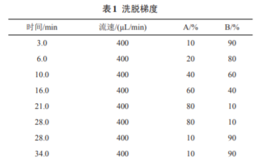 安捷倫Eclipse XDB-C18反相色譜柱 (4.6 mm×150 mm,3.5 µm),柱溫 40℃,流動相 A:B=乙 腈(: 水/0.1%甲酸),洗脫梯度見表1,進樣體積10 µL。